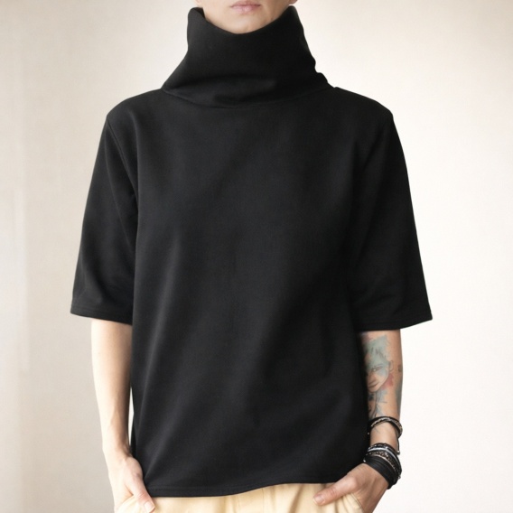 Klasyczna czarna bluza z twistem: duży golf i rękaw do łokcia w oversize’owym kroju.