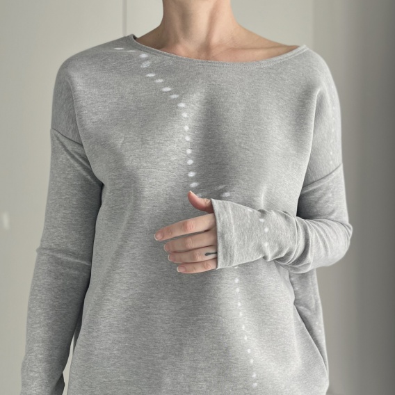 Jasnoszara, melanżowa, gruba bluza  z wąskim rękawem – ciepło i minimalizm.
