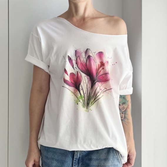 Biała koszulka oversize z akwarelowym nadrukiem rysowanych krokusów — kwiaty miękko przechodzą w tło niczym mistyczny sen.