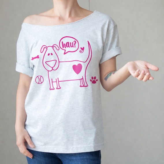 Ta koszulka ma w sobie wszystko: szarość, róż i psa. I to takiego z charakterem. Różowy nadruk z napisem „HAU” przyciąga wzrok, a cięty dekolt i oversizowy fason robią resztę – wygląda się świetnie i czuje jeszcze lepiej.