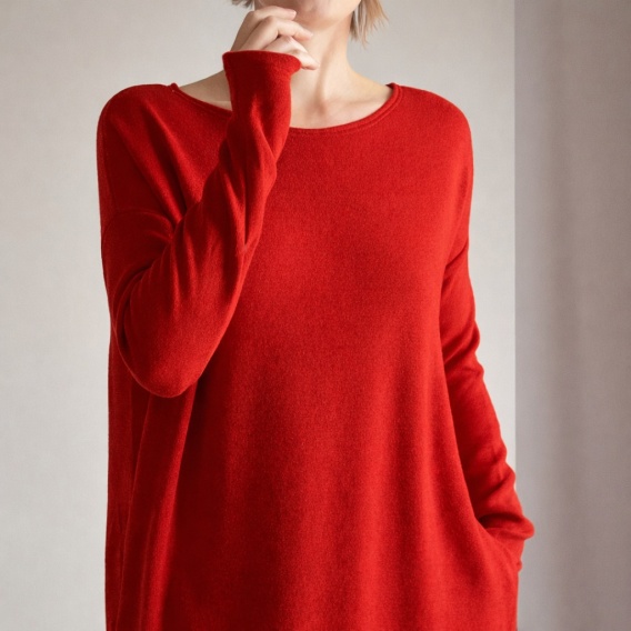 Swetrowa długa sukienka czerwona, prosty, oversize’owy krój otula sylwetkę i dodaje jej lekkości. Ta sukienka ma w sobie ciepło i pewność – jest kobieca, ale bez przesady.