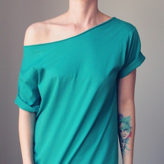 Szafirowa koszulka z szerokim, surowo ciętym dekoltem – bez obszycia, lekko rolowany brzeg dodaje jej swobodnego charakteru.