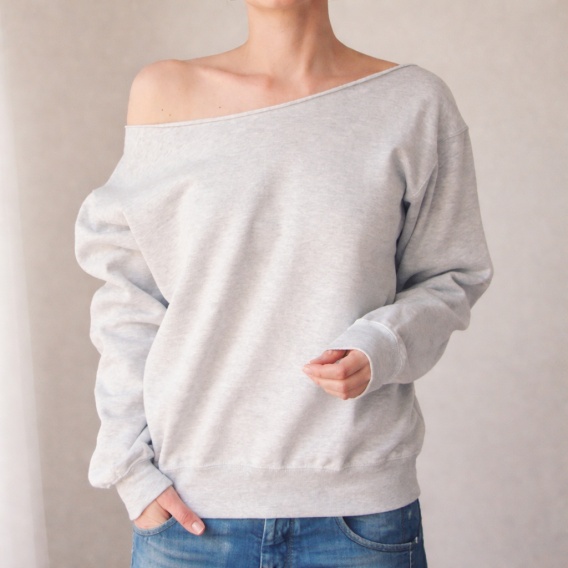 Szeroki dekolt. Cięte wykończenie dekoltu, rękawy i dół bluzy ze ściągaczami.