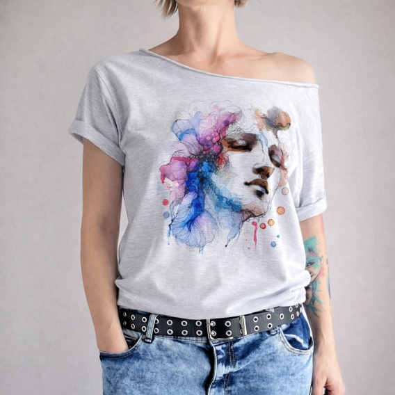 Lekka, luźna, kobieca koszulka. Tshirt z opadającym dekoltem z fajnym wzorem.