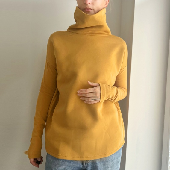 To nasz klasyk z golfem: gruba, miękka dresówka, długie, wąskie rękawy i podwójna warstwa golfu, która trzyma kształt i dodaje charakteru całości.