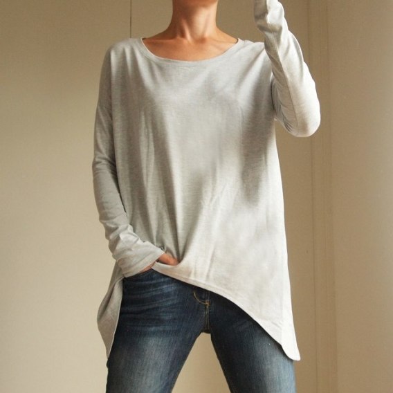 Luźny krój, wąskie rękawy i szerokie, miękko układające się boki dają swobodę ruchu i lekko otulają linię sylwetki.